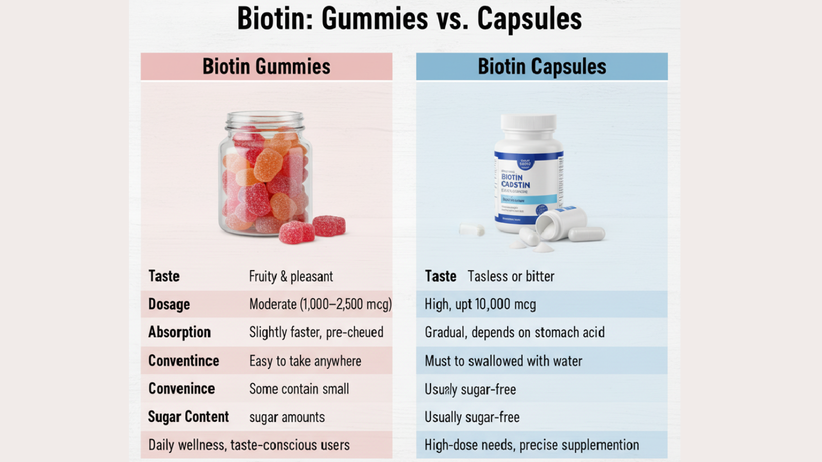 Both biotin gummies and capsules effectively support hair growth, nail strength, and healthy skin. The choice depends on your lifestyle, dosage needs, and personal preference: