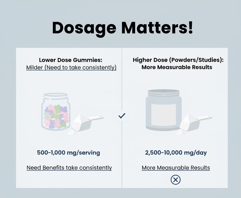 So while gummies do work, they may provide milder benefits compared to higher-dose powders unless you take them consistently over time.